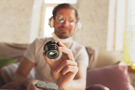Young man studying at home during online courses for photographer, studio assistant. Getting profession while isolated, quarantine against coronavirus spreading. Using laptop, smartphone, headphones.
