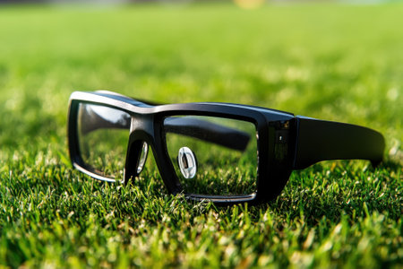 Sunglasses rest on lush green grass, capturing the warm glow of a sunny afternoon at the park.