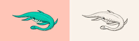 Dinosaurs Elasmosaurus, Mosasaurus, skeletons, fossils, winged lizard. American Prehistoric reptiles. Jurassic. Engraved vintage Hand drawn sketch for t-shirt print or poster.