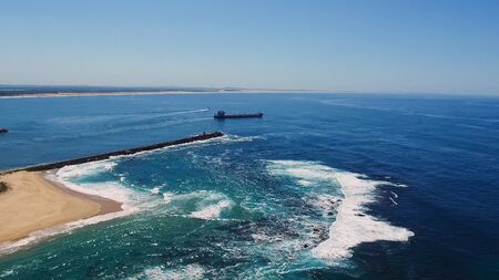 drone aerial shot of a coal freighter leaving newcastle