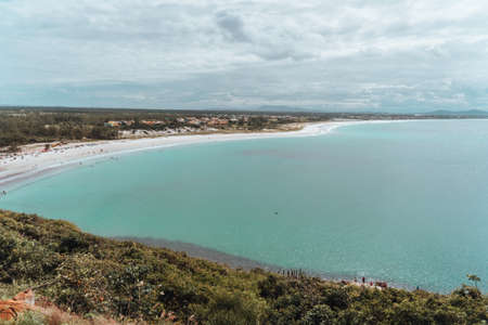Aerial view of the sandy beach and turquoise sea. Drone photography.