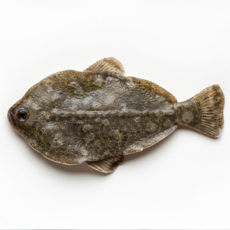 A detailed photograph of a flatfish showcasing its unique shape and smooth texture, set against a clean white background, ideal for culinary and marine-themed projects.
