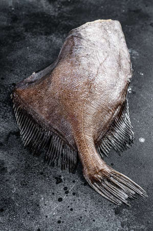 Frozen halibut pack set, on old dark wooden table background, top view flat lay, with copy space for text