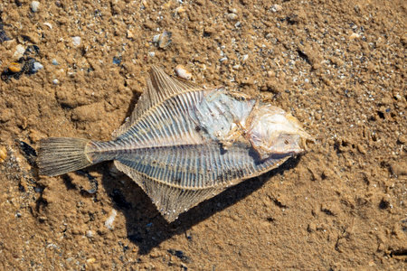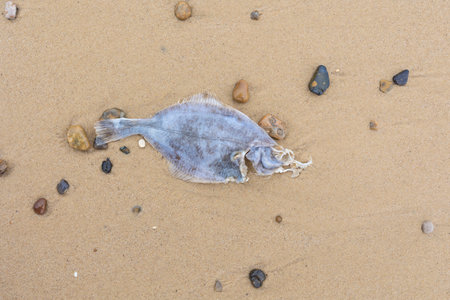 a dead half eaten flat fish on a sandy beach from above detailed
