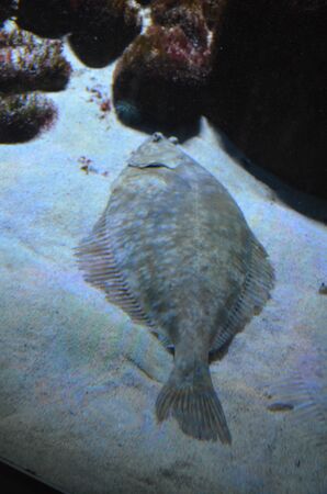 Flat sea fish flounder in the sand and in the flicker of light.