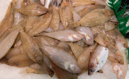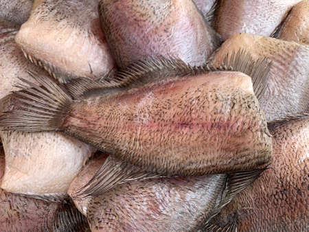 Chon Buri, Thailand - March 16, 2019: Nong Mon market. Closeup of heap of fresh flat brown fishes shining from reflecting light on the liquid surfaces.