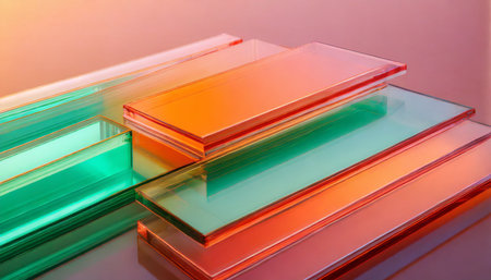 Stacked translucent glass rectangles in soft pastel colors with subtle lighting. Clear details and vibrant col...