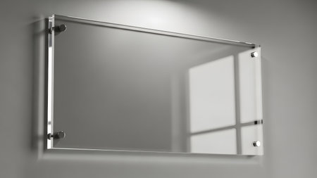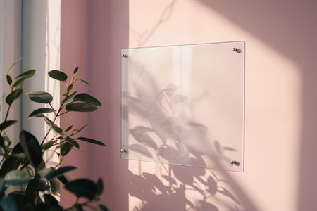 Blank transparent glass signboard on wall mockup. Empty hanging plexiglass name plate mockup. Clear namesign on wall for corporate or store. Generative AI illustration. Generative AI illustration