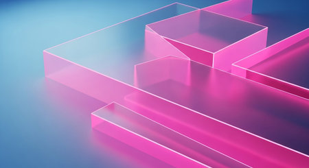 This abstract composition showcases a collection of transparent geometric forms, including rectangular prisms and angular structures, arranged in a dynamic layout. The edges of these translucent shapes are highlighted with a vivid pink neon light, casting a soft glow that interacts with the surrounding environment. The background transitions from a light blue to a deeper blue, creating a subtle gradient that enhances the sense of depth and space. The emphasizes clean lines, smooth surfaces,...
