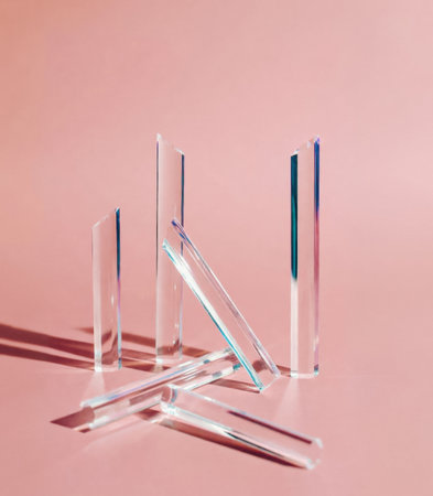 Modern minimalist still life featuring transparent clear acrylic glass rods, tubes and prisms arranged artistically on soft pink pastel background with dramatic shadows. Contemporary abstract composition with geometric crystal-like elements creating elegant reflections and light refraction. Perfect for beauty, skincare, cosmetics, luxury product display, science, technology, innovation concepts and modern design aesthetics emphasizing transparency, purity and sophistication.
