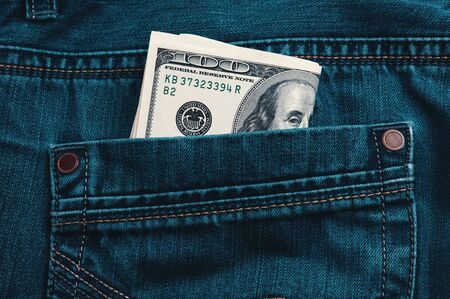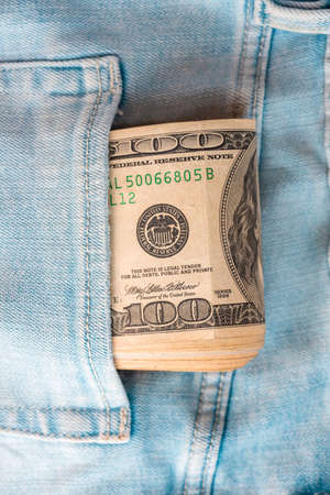 Cash in your pocket. A hundred dollar bills stuck out of the back pocket of blue jeans. Money saving concept