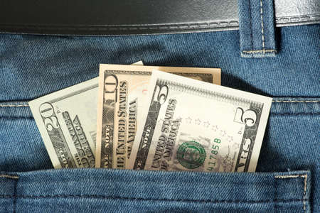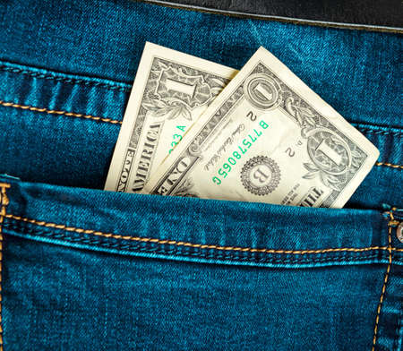 Dollars in the pocket of blue denim pants close up.