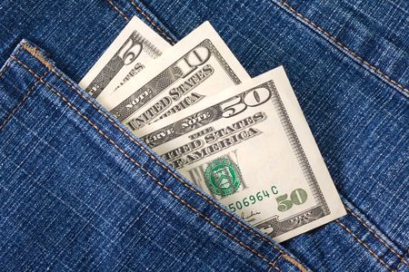 Dollar bills in a blue jeans pocket