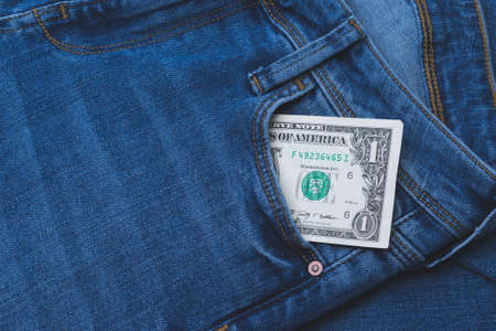 An image of a US one dollar banknote sticking out of a pocket of blue jeans. The idea of savings, cost planning and budgeting.