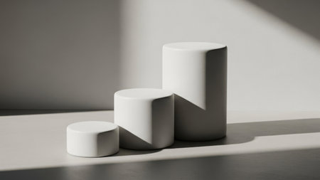 Three smooth matte cylinders arranged in varying heights with a soft gradient from beige to light gray tones set against a plain light background. The feature subtle shading and a clean...