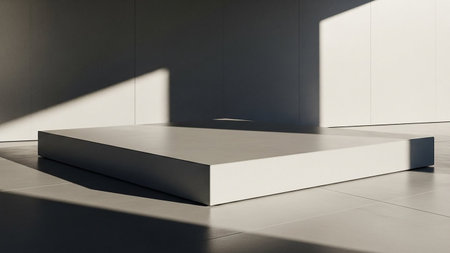 A minimalist white rectangular platform bathed in dramatic sunlight, casting sharp shadows on a clean, bright surface.
