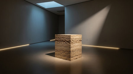 A square stone pedestal with layered texture sits in a dark gallery illuminated by a dramatic spotlight and horizontal light lines.