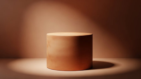 A smooth terracotta cylindrical pedestal is centered in a softly lit space, with subtle shadows and a warm, neutral background.