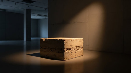 A rough, layered block of earth or stone serves as a pedestal in a dimly lit gallery, with a spotlight casting a dramatic shadow.