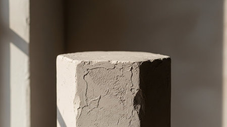 A close-up view of a textured, hexagonal plaster pedestal with rough edges, casting shadows from sunlight.