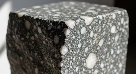 showing close-up of a cubic sample of asphalt concrete with visible aggregates and light reflections. resolution