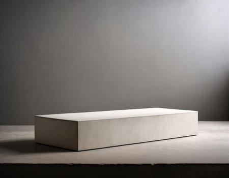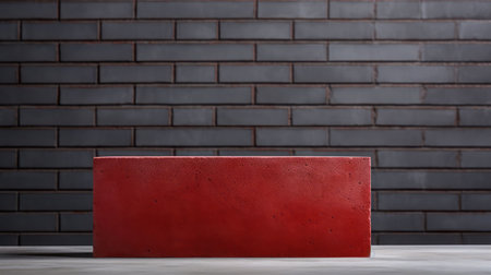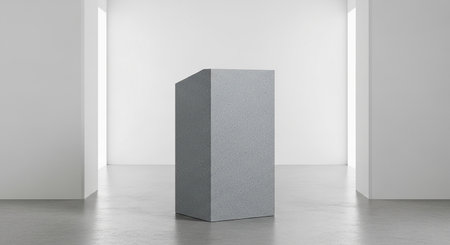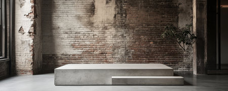 A minimalist concrete podium with a smooth, matte finish, set against a stark, industrial-style background with exposed brick walls.