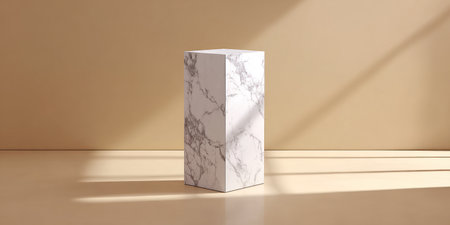 A marble pedestal stands in front of a golden wall with shadows, a minimalist and elegant composition