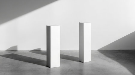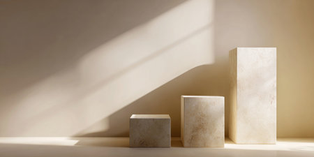 Three textured pedestals of varying heights are bathed in sunlight, creating shadows on a warm-toned background