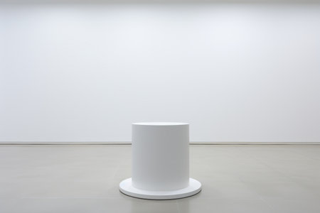 Grey cylinder on a wooden pedestal in a room with white wall