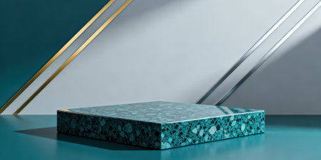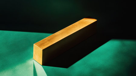 This artistic image showcases a golden rectangular block resting on a teal surface, enhanced by striking shadows and highlights. The composition emphasizes minimalism and elegance, creating a captivating visual experience.