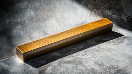A long metallic bar sits elegantly on a textured concrete surface, casting striking shadows in soft natural light, showcasing a minimalist aesthetic.