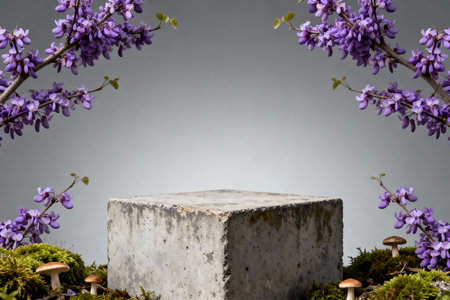 Wooden pedestal with purple flowers and green moss on gray background
