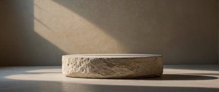 AI Generated. A minimalist stone podium in a warmly lit space with soft shadows , minimalist, product display, stone podium, serene, composition, cylinder, neutral colors, modern, elegant, clean