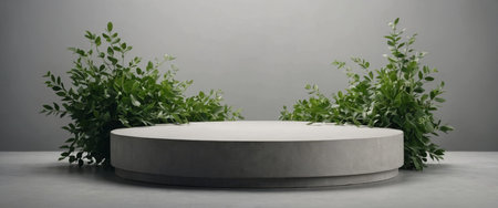 AI Generated. Top view of an empty round podium with green leaves on a light grey background, ideal for eco product presentations