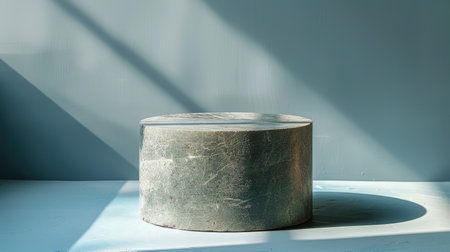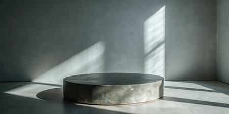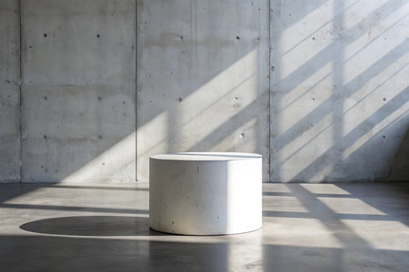 White round podium on concrete floor with sunlight and shadows.