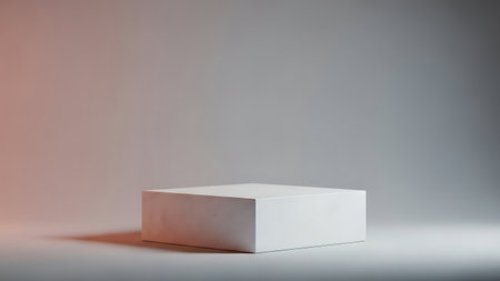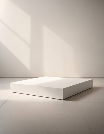 Minimalist white cube pedestal casting a dramatic shadow against a textured gray wall with soft light