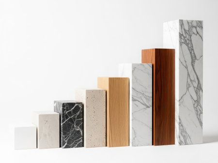 A collection of rectangular blocks showcasing various materials including marble and wood, arranged in a stepped formation.