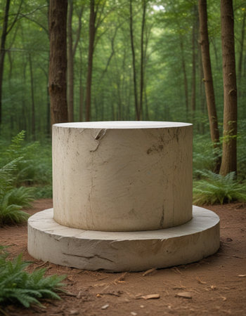 Stone pedestal in the green forest. Natural stone pedestal.