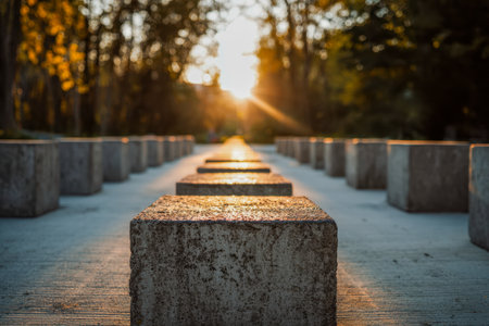 Concrete blocks are arranged along the edge of a calm pathway under soft lighting creating an urban ambience during the early morning hours.