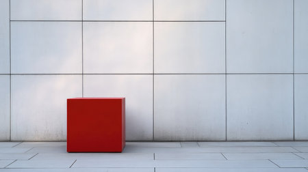 A striking red cube sits isolated against a sleek, minimalist white wall featuring geometrical patterns, exuding modern elegance and tranquility.