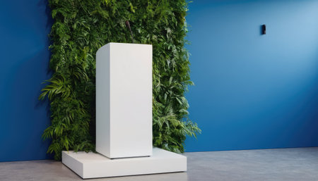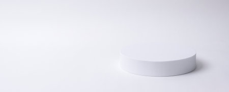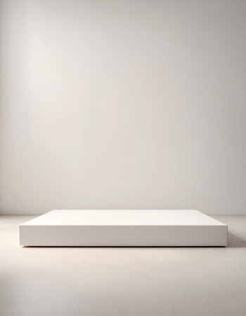 A white rectangular pedestal designed for product display, positioned against a wall background. This setup offers a clean and modern platform for showcasing various items, enhancing their visibility and elegance, making it ideal for retail environments, exhibitions, and photography.