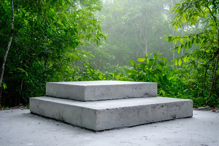 A minimalist concrete platform rests amid vibrant greenery, shrouded in a gentle mist. This serene forest setting invites tranquility and reflection, showcasing nature's beauty.