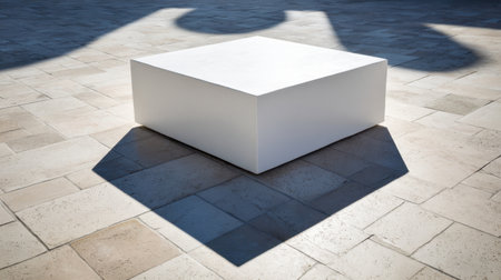 A striking minimalist white cube rests on a textured stone surface, casting intricate shadows that enhance the modern aesthetic of the outdoor environment.