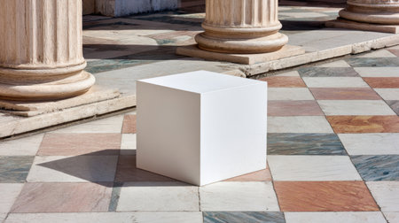 A striking minimalist white cube rests on a colorful patterned floor, surrounded by classic columns, creating an elegant and timeless architectural scene.