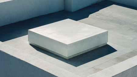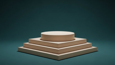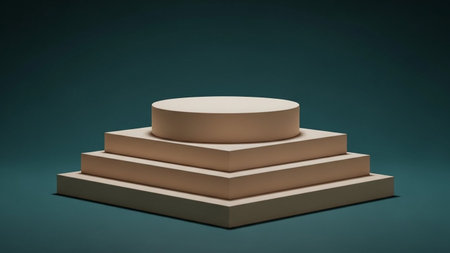 A minimalist stepped geometric podium with soft studio lighting casting subtle shadows and highlighting its clean lines.