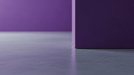 A minimalist interior space featuring smooth, cool-toned concrete flooring that reflects subtle light. The walls are painted in a soft, muted shade of purple, creating a serene and atmosphere. The composition focuses on clean lines and geometric forms, with a corner of a purple structure jutting into the frame, emphasizing the simplicity and modern aesthetic of the