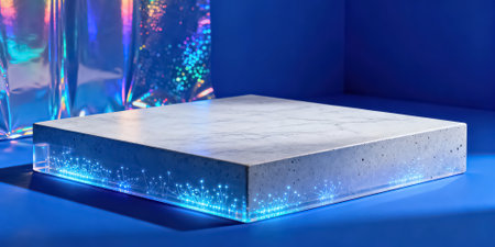 Empty white marble podium for product presentation in blue neon light. 3D rendering