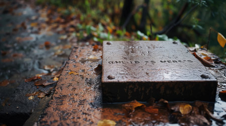 Wet utility cover with leaves and rain
