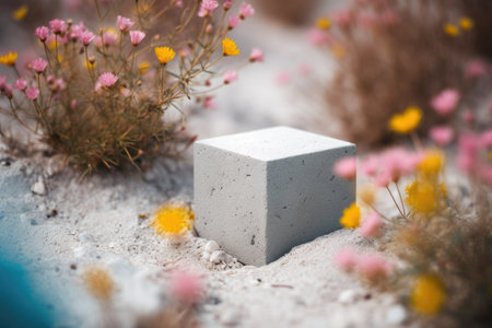 An AI generated illustration of a grey concrete block on a sandy beach surrounded by vibrant flowers