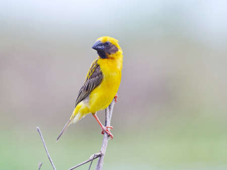 Bright and yellowish male Asian Golden Weaver perching on dried perch, looking into a distance
